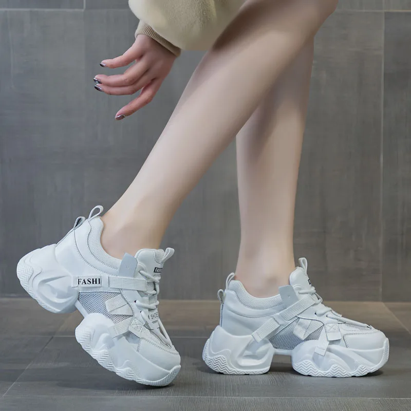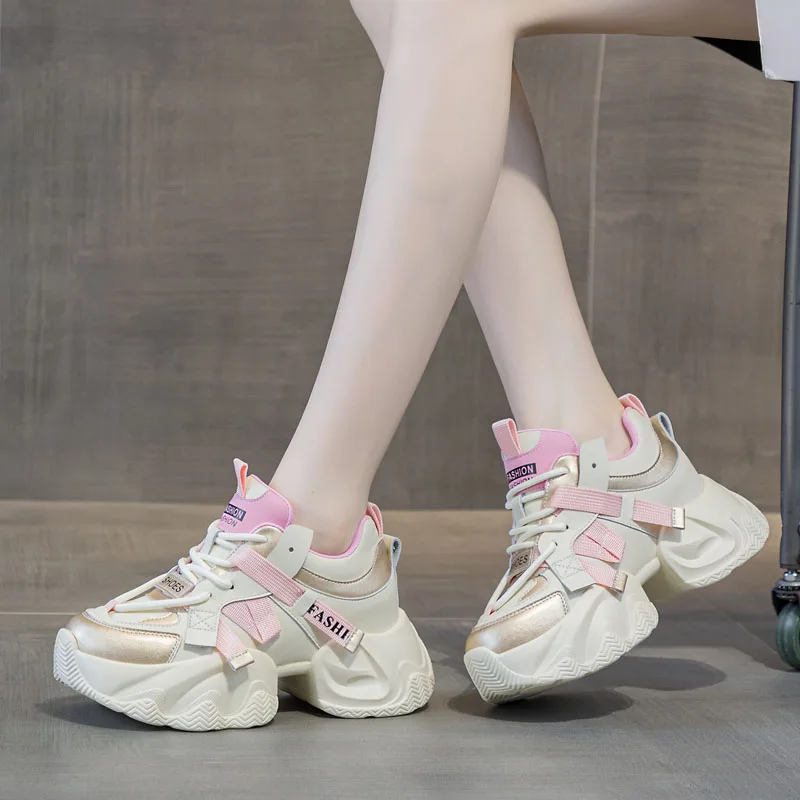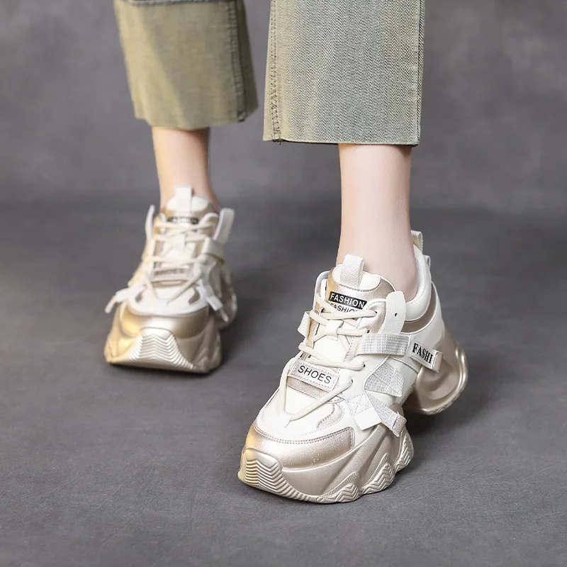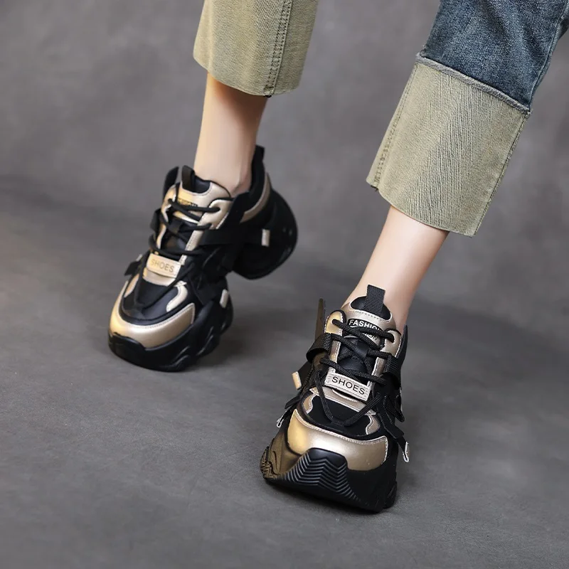 2026 Fashion Mixed Colors Height Increasing Casual Shoes Women Chunky Platform Sneakers Comfort Cowhide Dad Shoes Female