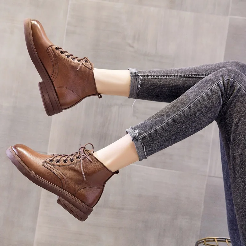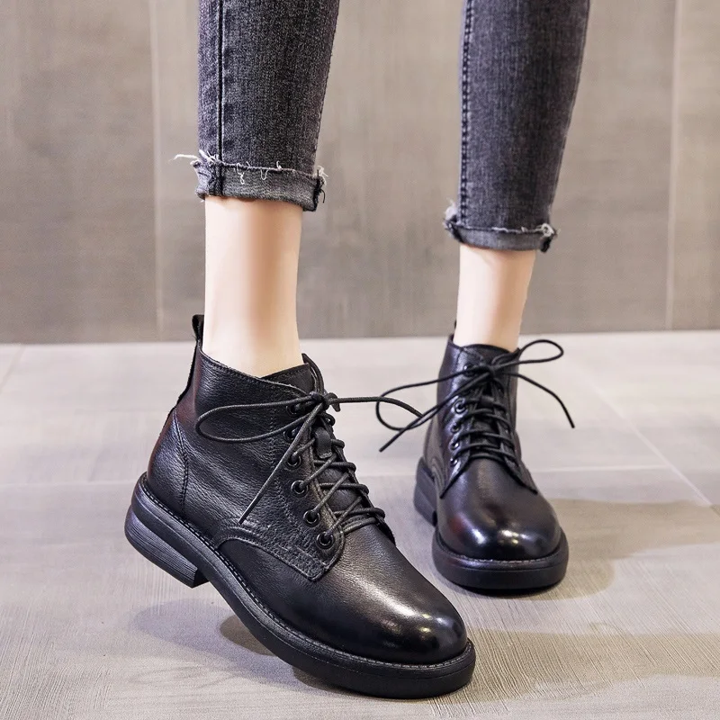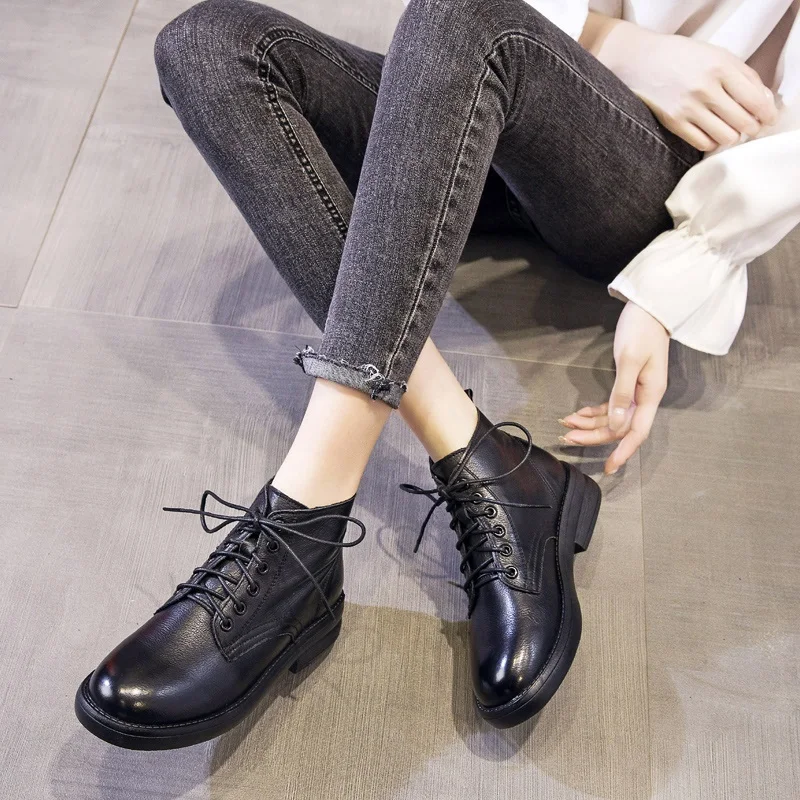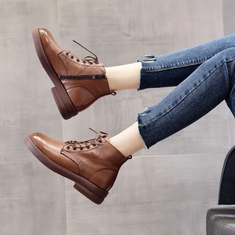 2026 Women Thick Heel Ankle Boots Autumn Winter Warm Shoes Round Toe Cow Genuine Leather Med Heel Retro Casual Boots