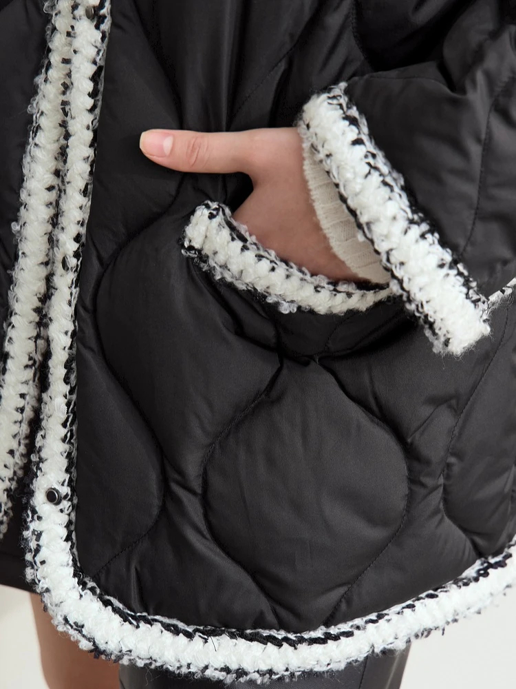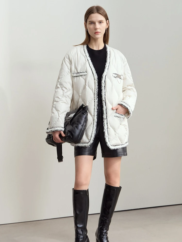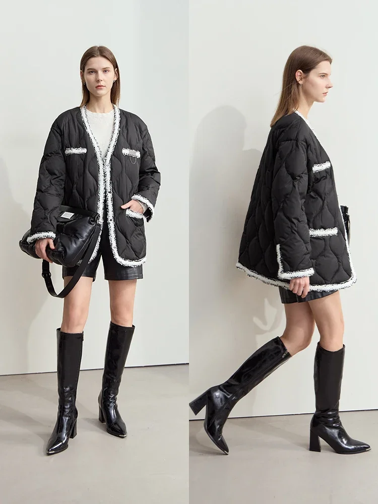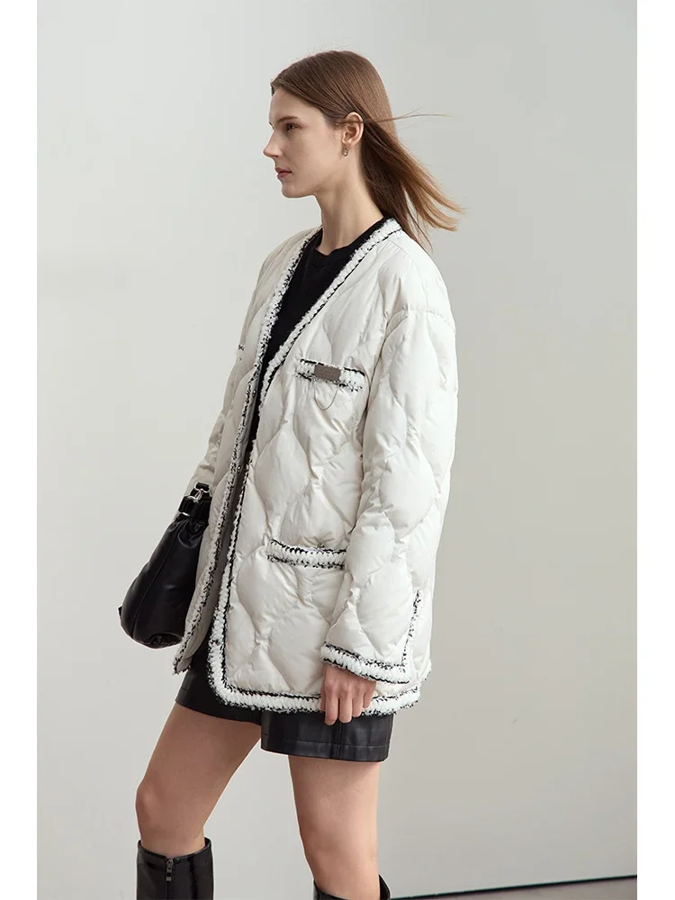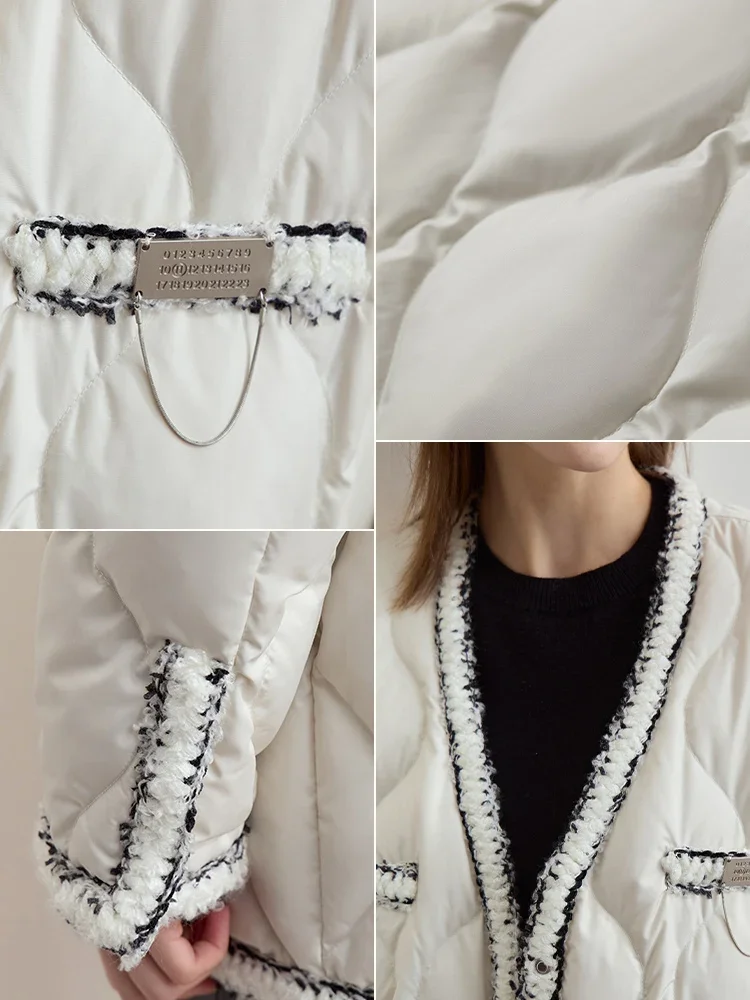 Minimalist Patchwork Down Jackets For Women Trendy V-neck Metal Tag 2025 Winter Female Mid-length Loose Outerwear 12444051
