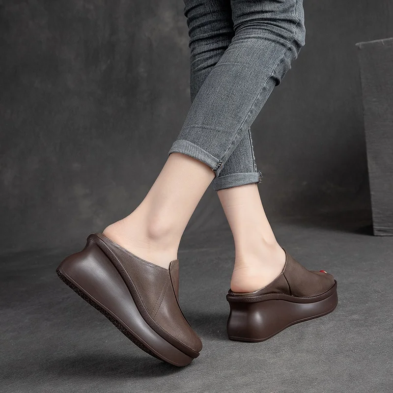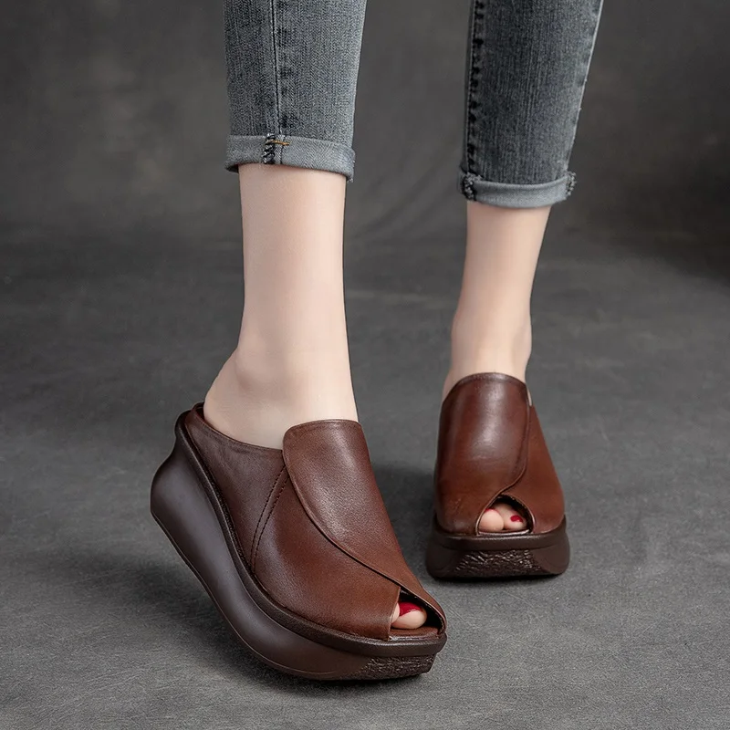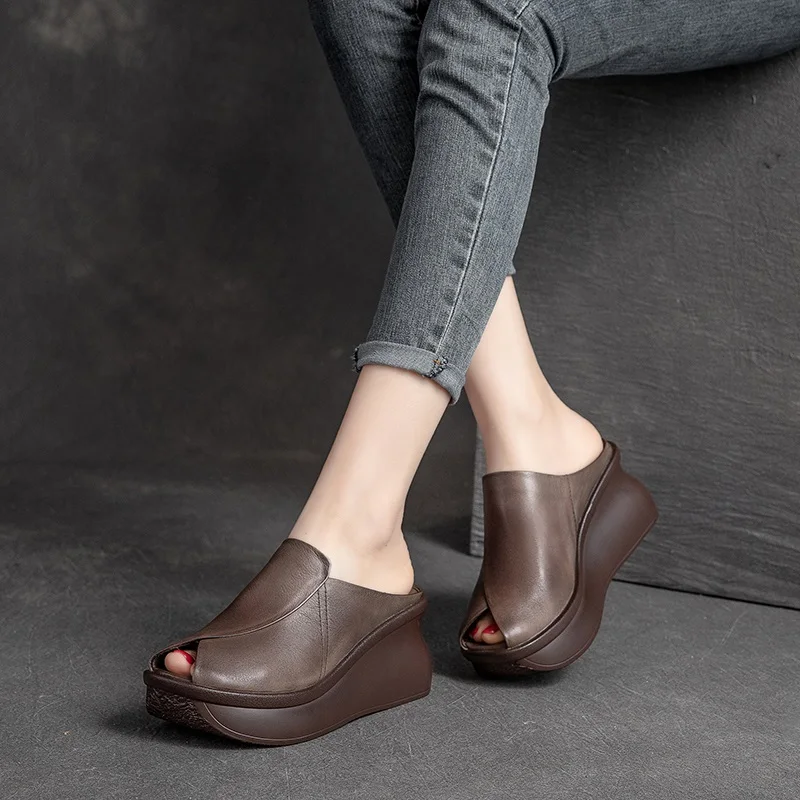 Wedges Heel Slippers Women Summer Slip On Fish Mouth Genuine Leather Slippers Height Increasing Platform Casual Slides